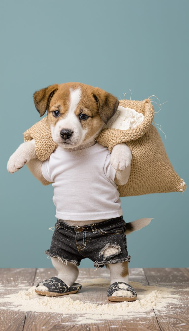 This image shows a cute, small puppy dressed in tattered clothing, lifting a sack of flour. The image is a digital rendering of a puppy working hard.