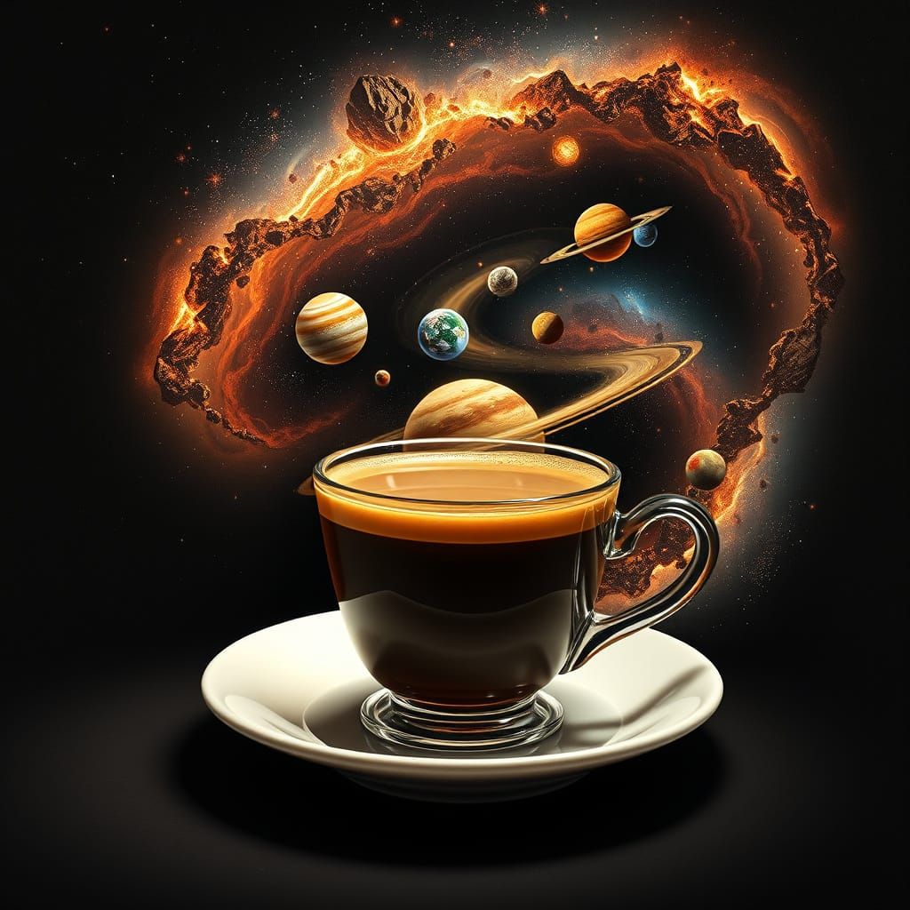 A striking picture of a coffee cup seemingly crafted from the universe itself. Coffee swirls like nebulae, planets orbit the cup, set against a dark backdrop of twinkling stars; 3D rendered digital art.