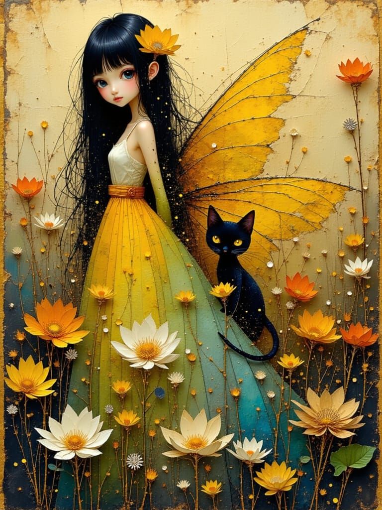 This image is a vibrant oil painting of a beautiful fairy with long black hair, a long flowery dress, and a cute cat, rendered in a textured and colorful style with golden accents.