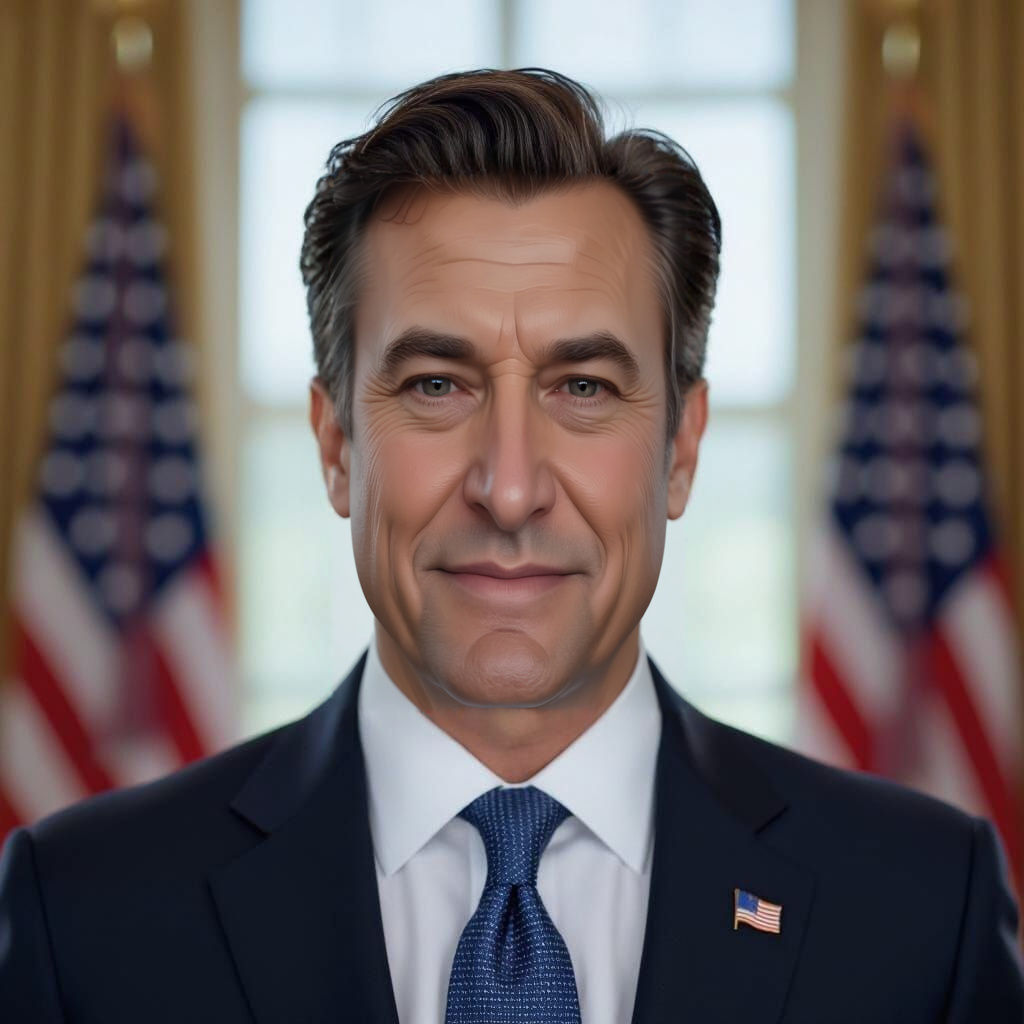 "Ultra-realistic 8k cinematic portrait of the President of the United States, a man in his 50s. Intellectual and charismatic, with a medium build and a presence that blends authority with approachability. His expression carries both a sharp, decisive gaze and a warm, diplomatic smile. He is dressed in a luxurious, perfectly tailored suit that reflects elegance and power. The atmosphere conveys leadership, wisdom, and global influence. he is shown standing at a presidential podium ..."