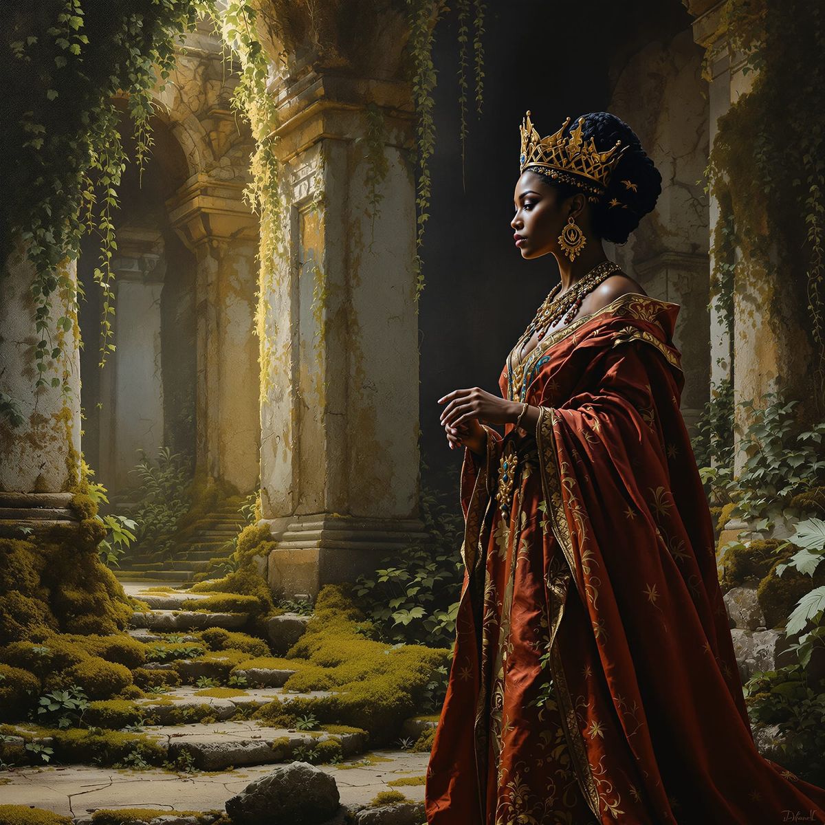 This hyperrealistic oil painting shows an African queen in Renaissance robes within a vine-covered temple. Dramatic light and shadow highlight an ancient artifact, evoking solemn reverence and lost grandeur.