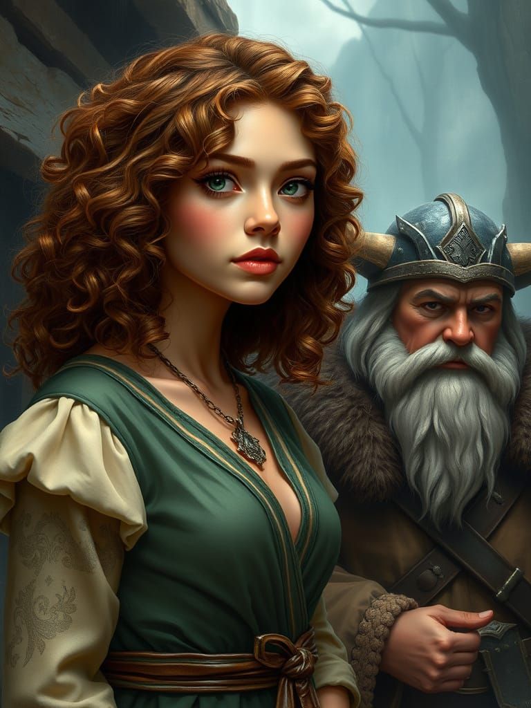 Female Hobbit with perfect curly brown hair, huge bosom, tan complexion, Standing next to a female Dwarf, detailed matte painting, deep color, fantastical, intricate detail, splash screen, complementary colors, fantasy concept art, 8k resolution trending on Artstation Unreal Engine 5