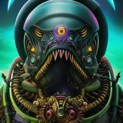 This image shows a bizarre, nightmarish alien Teletubby with a proboscis emitting dangerous energy. The artwork has a hyperdetailed and intricate surreal sci-fi aesthetic.