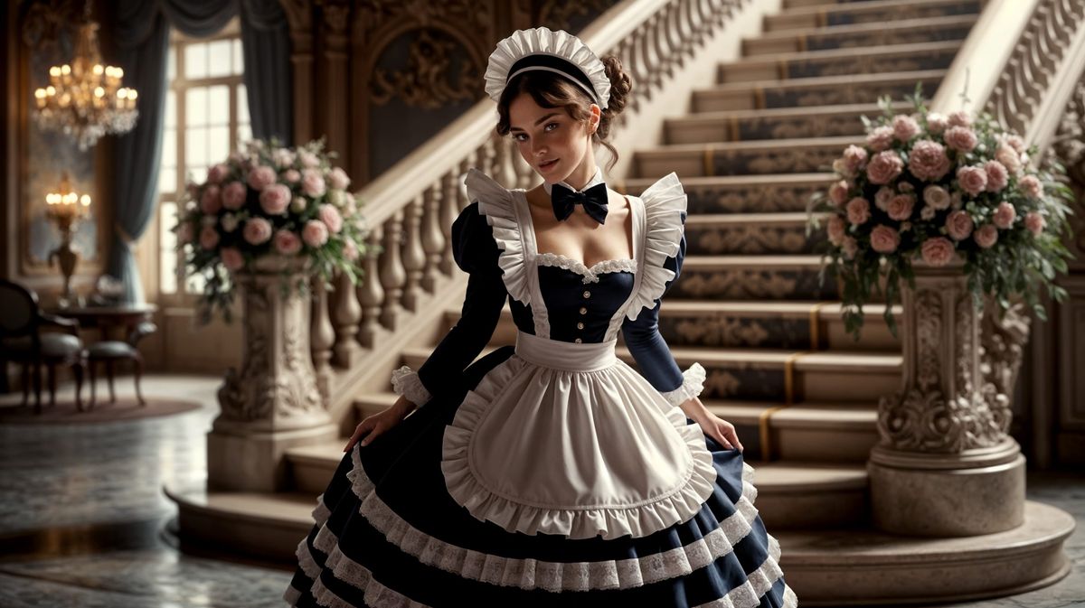 This image depicts a beautifully dressed French maid curtsying before a grand staircase with lush floral arrangements. Soft lighting and delicate shadows highlight her intricate attire and the opulent surroundings.