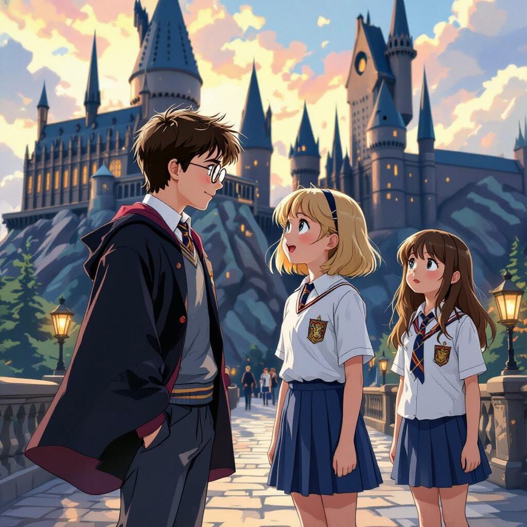 A vibrant anime-style image of Harry Potter whispering to a blonde girl in front of Hogwarts. Her friend looks on, puzzled, in this scene rendered with dynamic lighting and detailed textures.