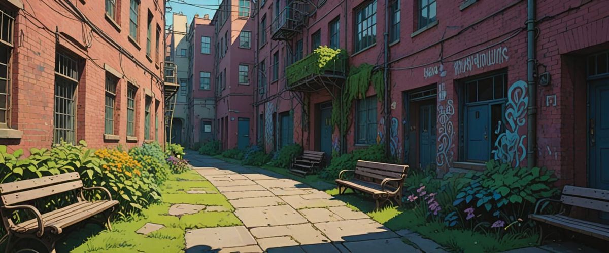 This image shows an abandoned factory district with graffiti and benches, rendered in a comic book style. The watercolor and gouache painting features vibrant indigo shadows and warm sunlight, with M.C. Escher-inspired architecture.