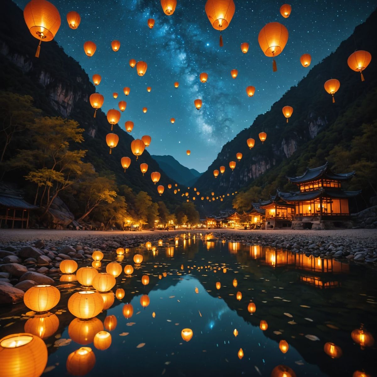 This image shows a tranquil river winding through mountains beneath a star-filled sky. Glowing lanterns float on the water, creating a magical, breathtaking display of light in a serene landscape.