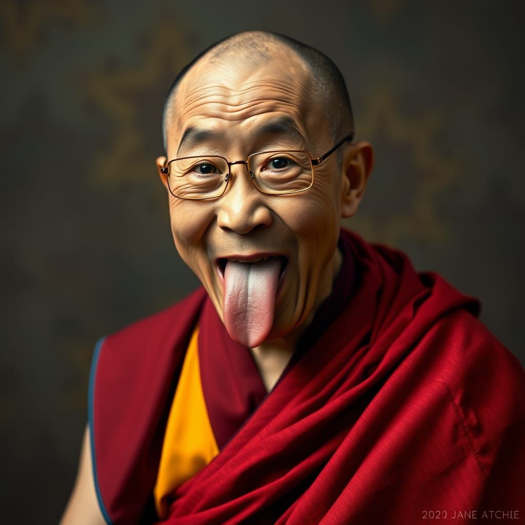 A photorealistic portrait of the Dalai Lama as a young man, wearing a colorful robe and sticking his tongue out. The image evokes Art Nouveau aesthetics.