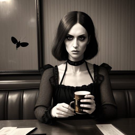 A goth coffee shop patron is surrounded by a swarm of insects in this dark academia-inspired photograph, shot in a vintage style with intense amber neon light and subtle grainy texture, reminiscent of the works of Bill Brandt and Man Ray