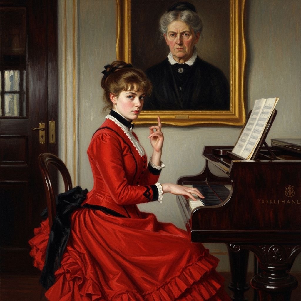 A young woman in a striking red 1880s bustle dress plays an ornate piano in a dimly lit room. A stern portrait hangs behind her, adding to the quiet domestic drama. Rendered with soft, diffused lighting.