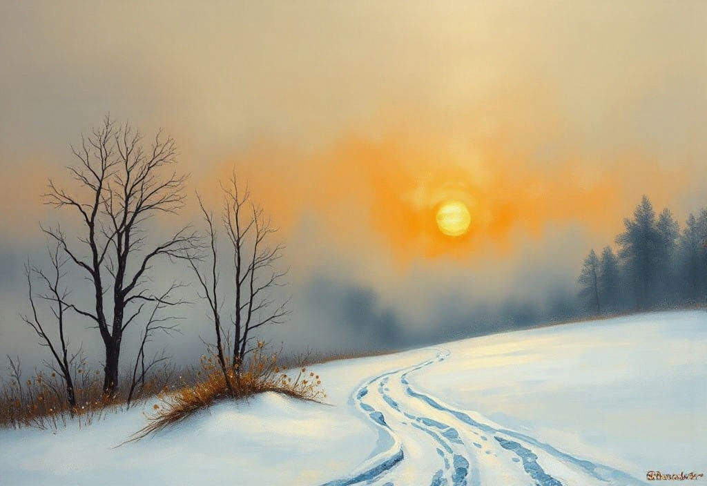 This striking image depicts a serene winter sunset with falling snow. Created as a mixed media painting, it evokes the rich textures and symbolic elements found in early 20th-century art.