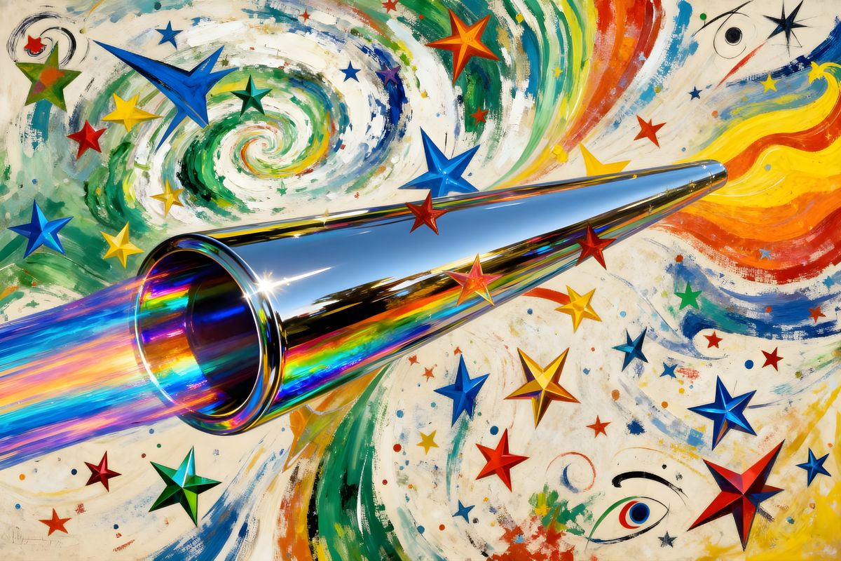 This image features a smooth, mirror-polished cylinder with high-velocity exhaust against a background of impasto oil paint, plasma, and stars. It depicts unbounded motion with vivid colors and infinite detail.