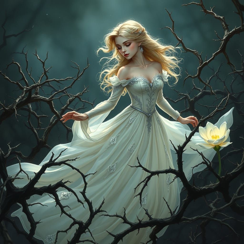 This image depicts a regal blonde princess fleeing a forsaken garden of twisted thorns, her delicate fingers grasping for freedom. A lone, shimmering flower blooms amidst the darkness, illuminated by the princess's determination and surrounded by the scent of damp earth and decay.