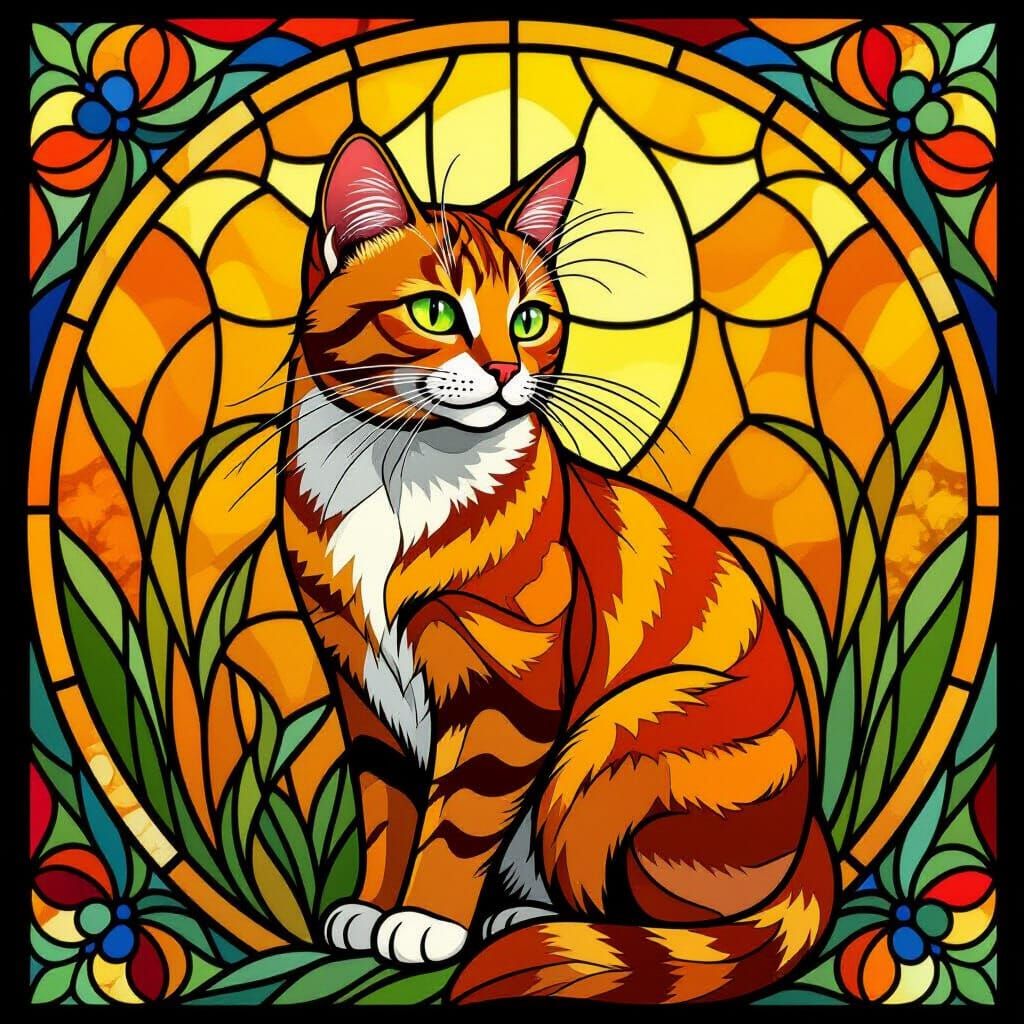 This image showcases a vibrant stained glass illustration of a tabby cat. Intricate leaded patterns and jewel tones glow with inner light, reminiscent of Tiffany's luminous artwork.