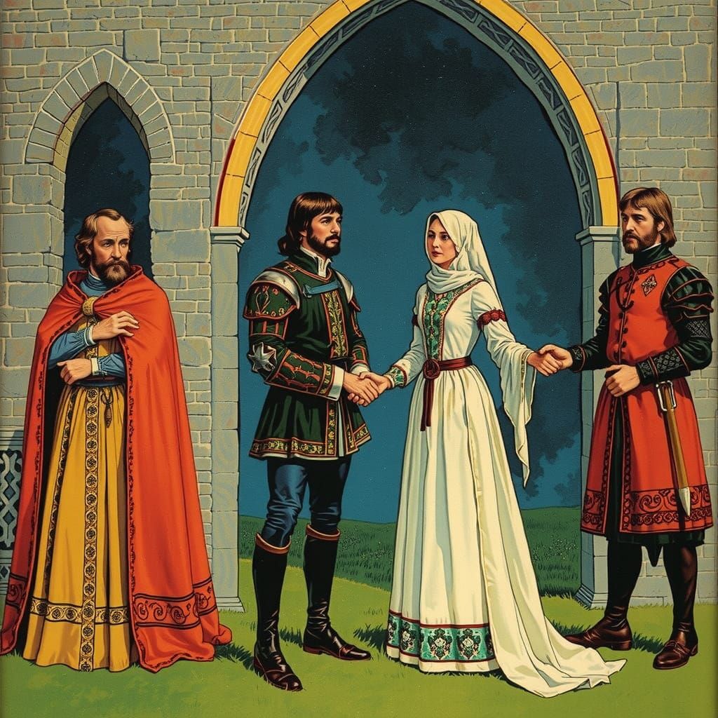 This image captures the essence of a medieval pulp illustration from the 1970s, characterized by bold lines, vibrant colors, and a nostalgic aesthetic reminiscent of classic fantasy art.