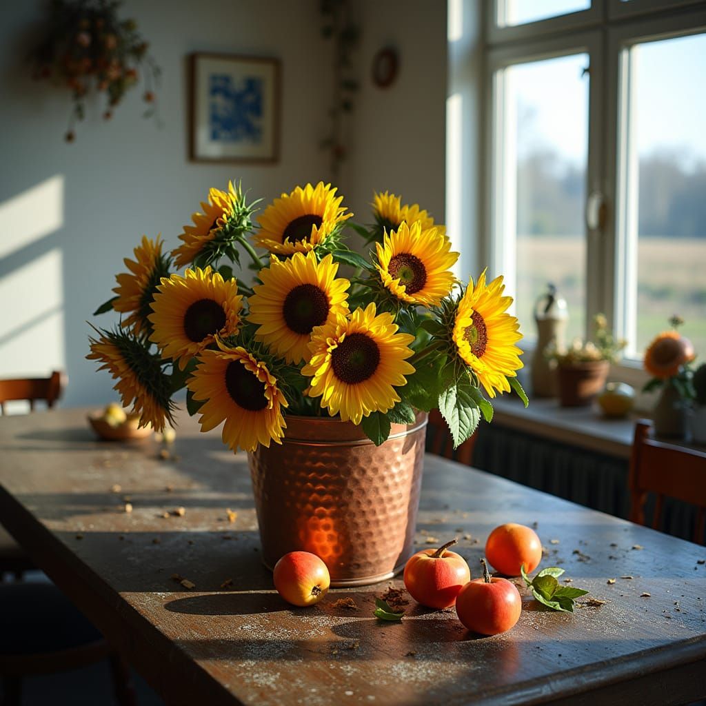 butcher table by a large bright window 5 bundles of arranged Sunflowers golden and delft blue in a dimpled copper bucket whitewashed walls contre-jour god rays radiant rays flower debris on floor and table chairs for table other bountiful fruits vegetables exaggerateda wide angle lense 8k resolution ...
