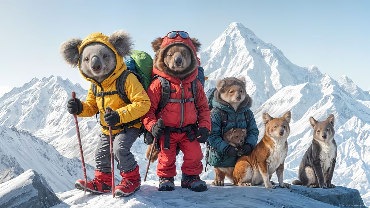 1 koala , 1 perro , una ardilla y un gato, mas 2 sherpas de Nepal humanos que les les llevan la carga mas pesada del equipo como ayudantes. Los 4 animales Son un grupo de montañeros muy felices completamente equipados para empezar a escalar la montaña Everest que se ve ya en el fondo de loa cordillera ...