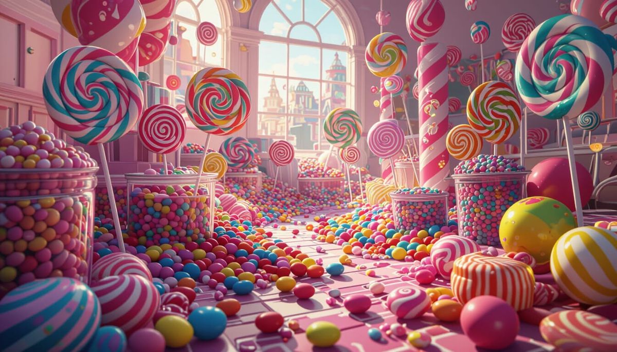 A vibrant school board is depicted, overflowing with colorful candies and sweets. The image employs a whimsical Candyland art style, enhanced by hyperrealistic textures, dynamic lighting, and a playful, cel-shaded aesthetic.