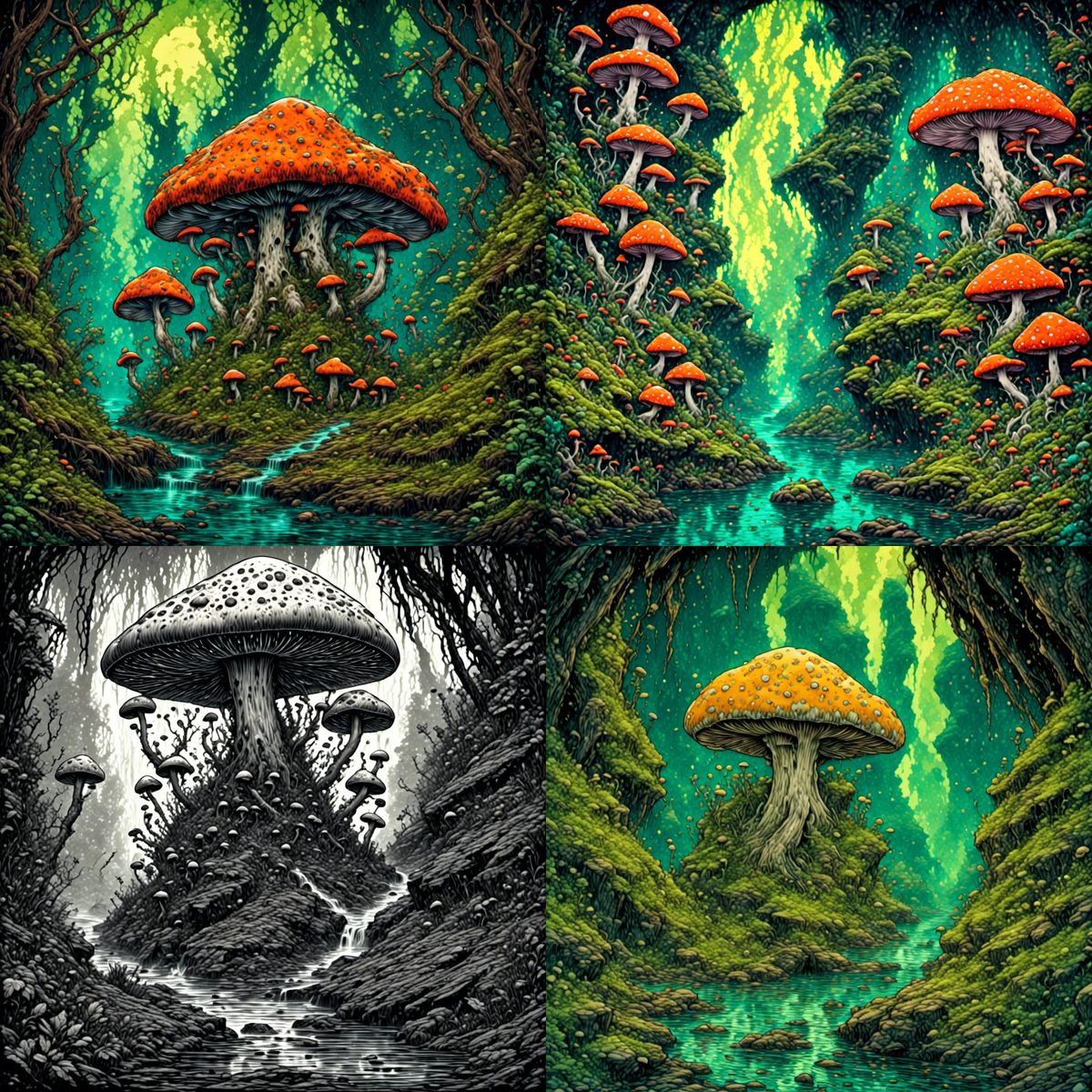 This image shows a monstrous mushroom creature emerging from a cavern. The fantasy illustration depicts a fungal forest with a river in vivid colors, rendered with bold lines in an ink and acrylic style.