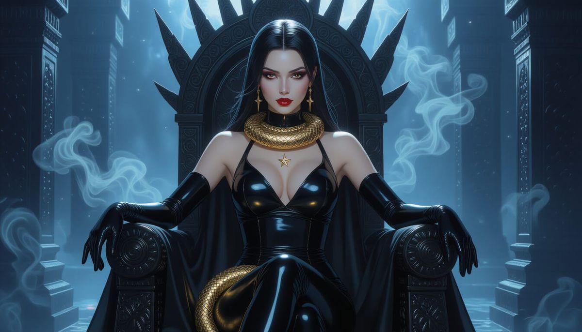 A striking picture of a snakewoman rising from glossy black latex. She sits on an obsidian throne, adorned with a golden serpent necklace, in a hyper-polished dark fantasy style with intense lighting.