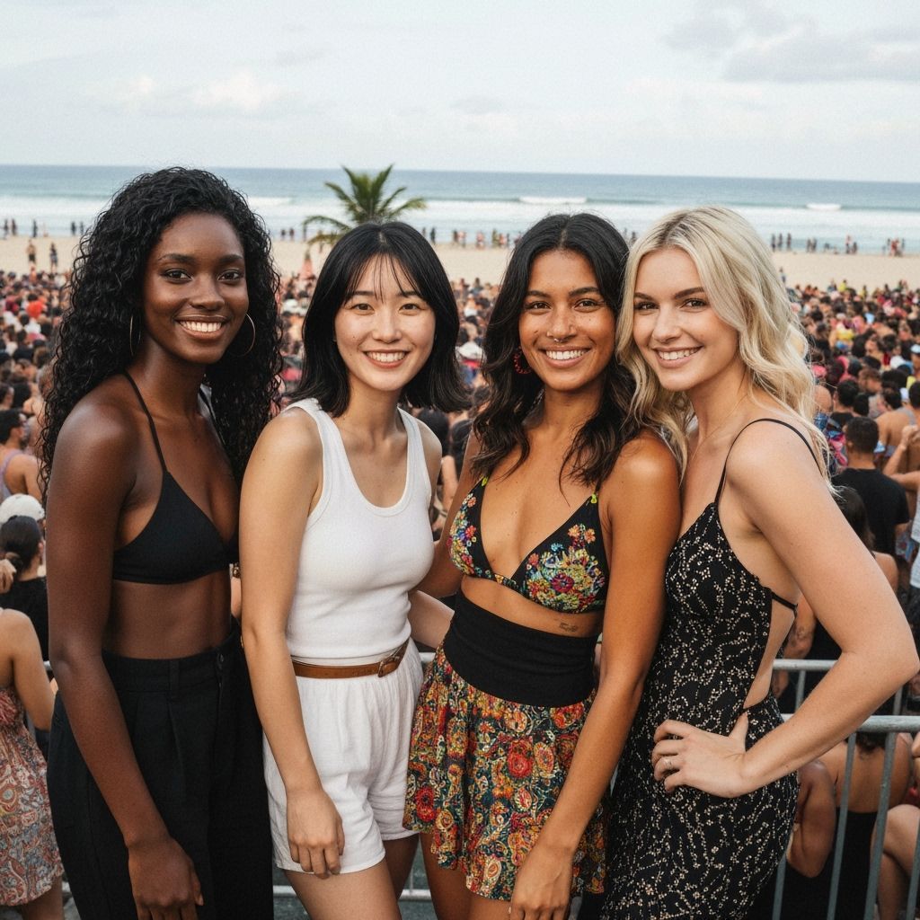 This image shows four smiling women of diverse ethnicities in high-fashion attire, enjoying a vibrant rock concert. Set in Brazil with a lively beachside crowd, the photorealistic image features a bokeh effect and natural lighting, resembling a professional DSLR photograph.