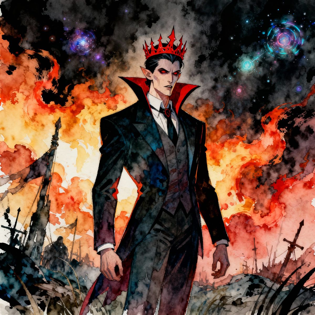 dark comic style, watercolor, high-gothic, ethereal, otherworldly, hyperdetailed, sublime, detailed, majestic, medium distance, ultra wide-angle, storytelling (detailed illustration, depict a striking, highly stylized man in a sharp suit and vampire-like collar, crowned with a jagged red diadem against ...