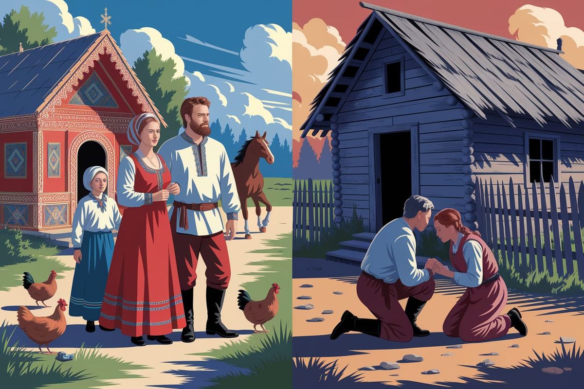 This image juxtaposes two contrasting scenes from a traditional Russian village, showcasing a lively family scene alongside a poignant depiction of hardship, set against a warm and golden backdrop.