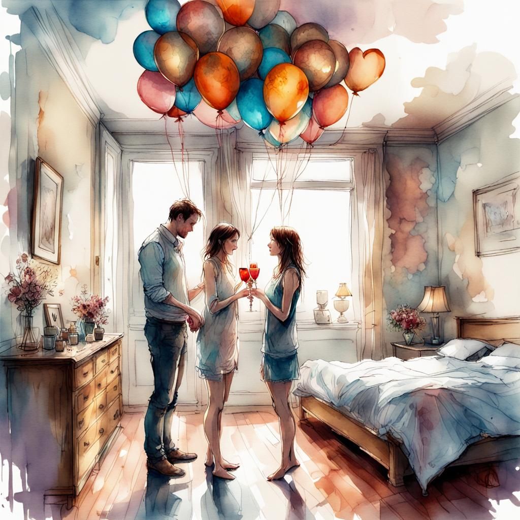 A digital watercolor illustration of a husband gifting a necklace to his wife on their anniversary. The cozy room is lit at night and decorated with balloons, chocolates, and champagne.