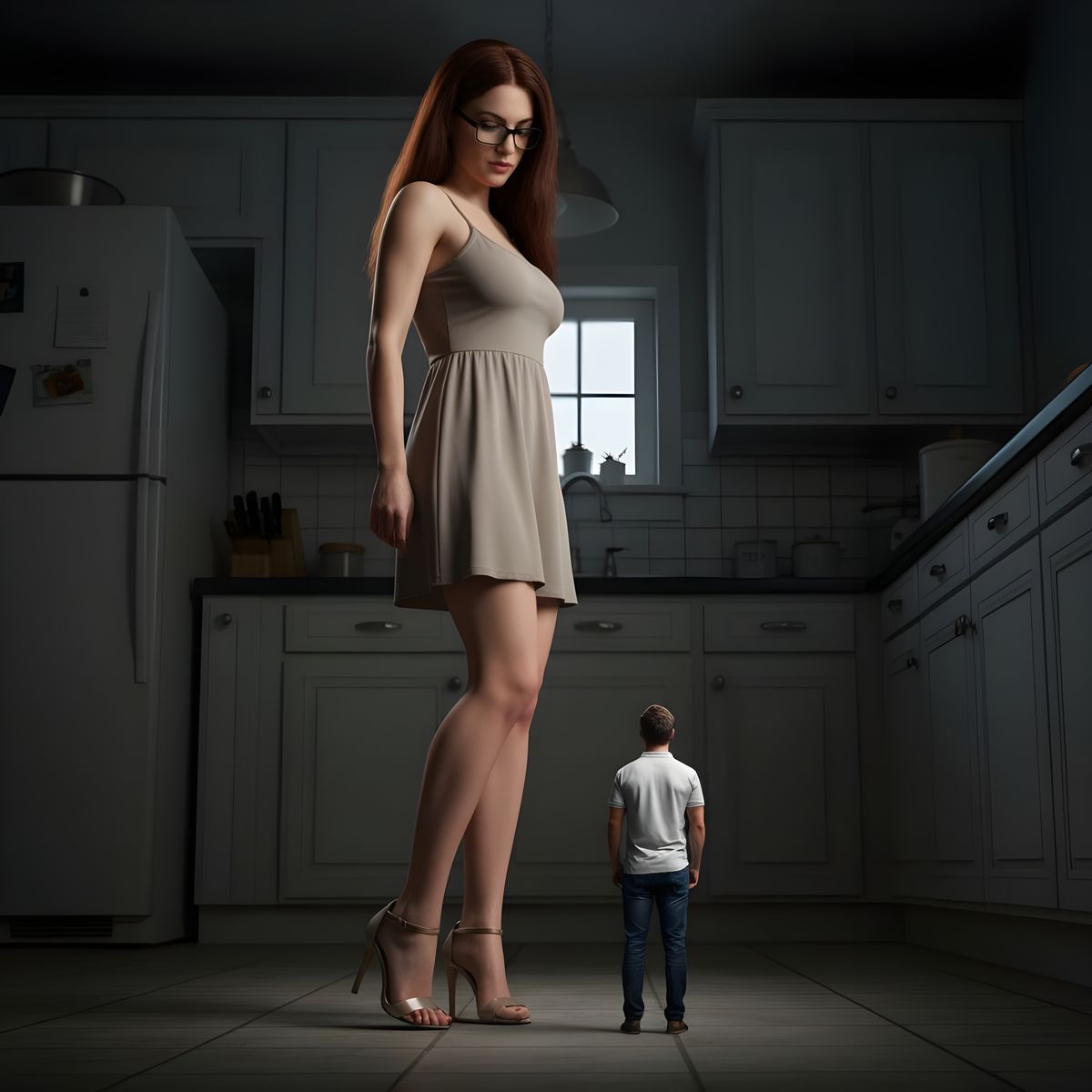 This photorealistic image captures a striking size difference, showing a woman towering over a miniature man in a detailed kitchen with dramatic lighting. The perspective emphasizes scale and detail.