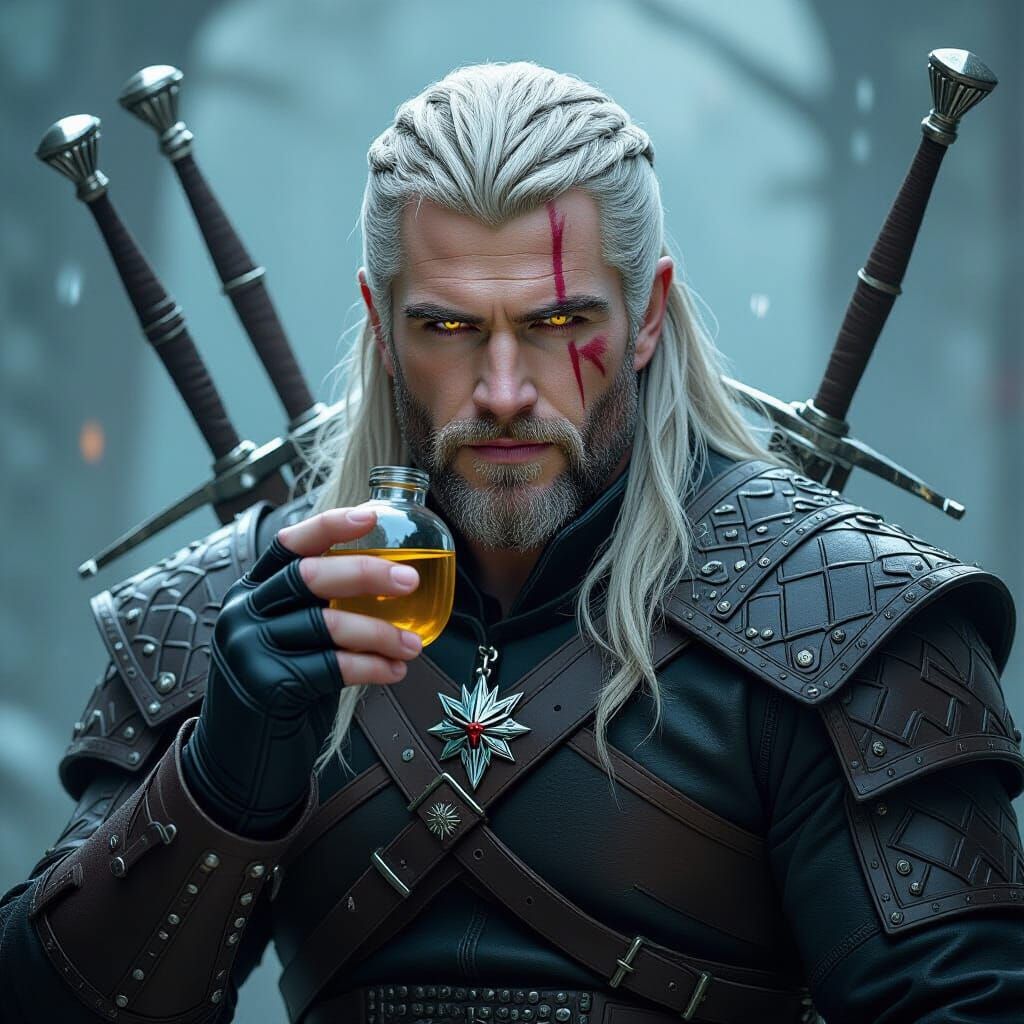 A striking picture of Geralt of Rivia with white hair and gold eyes, drinking a potion. He is wearing leather armor and a wolf medallion in a dark fantasy style.