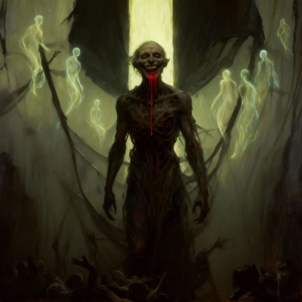This image depicts a grotesque, tormented figure with a disturbing smile, rendered in the style of classic horror illustrations with dramatic lighting and intricate oil painting details.