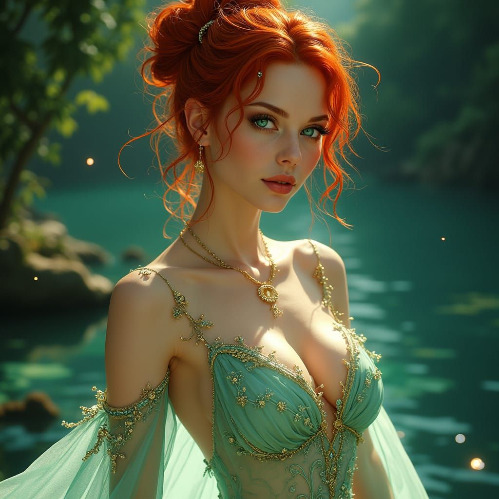 This enchanting portrait features a stunning sorceress with fiery red hair, emerald green eyes, and intricate golden piercings, set against a backdrop of diaphanous, flowing fabric and vibrant, neon accents, blending futuristic and Art Nouveau styles with a touch of surrealism.