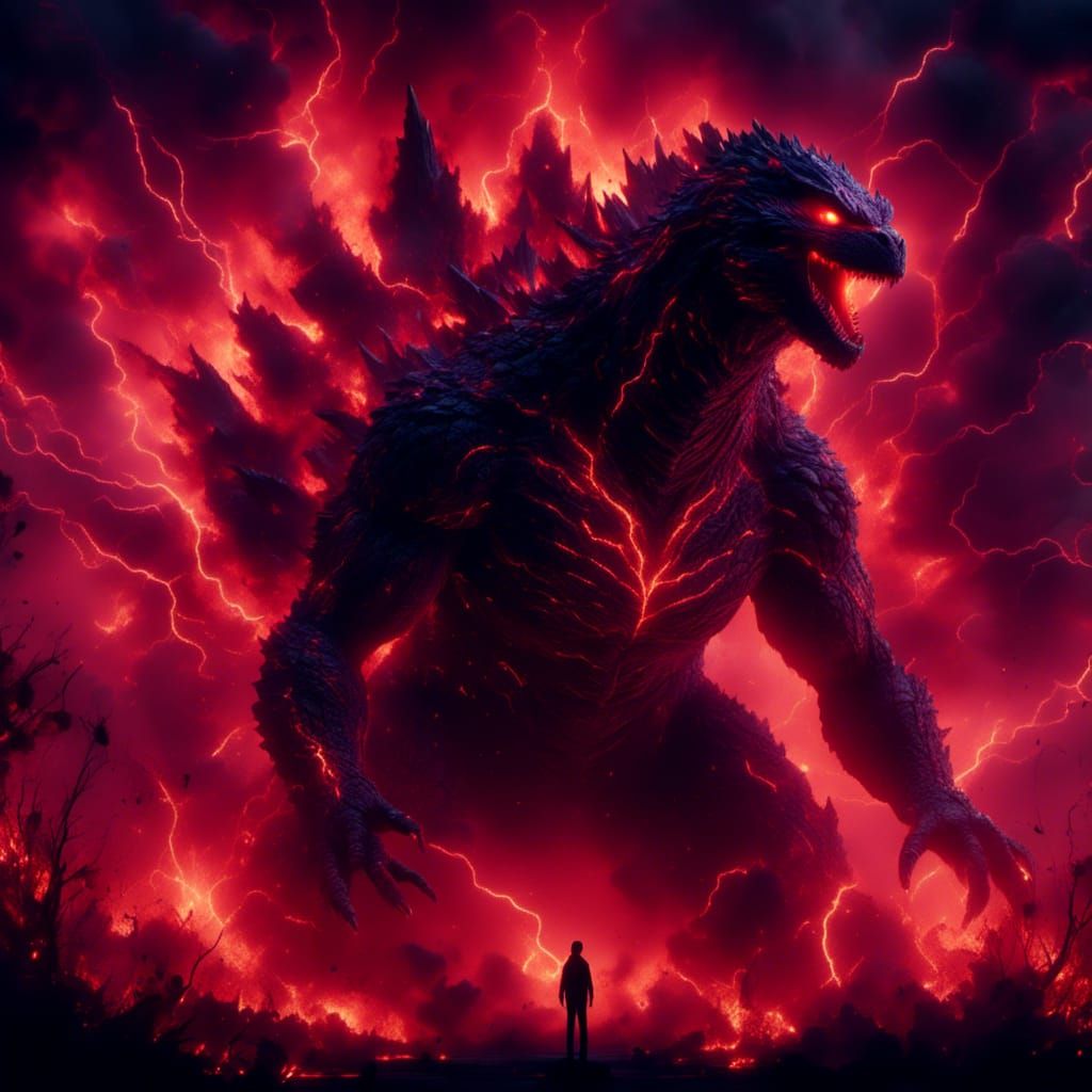 This image shows a colossal, Godzilla-esque figure dominating a war-torn night sky. The scene is rendered in a cinematic style, reminiscent of a film still with dramatic lighting and atmospheric depth.