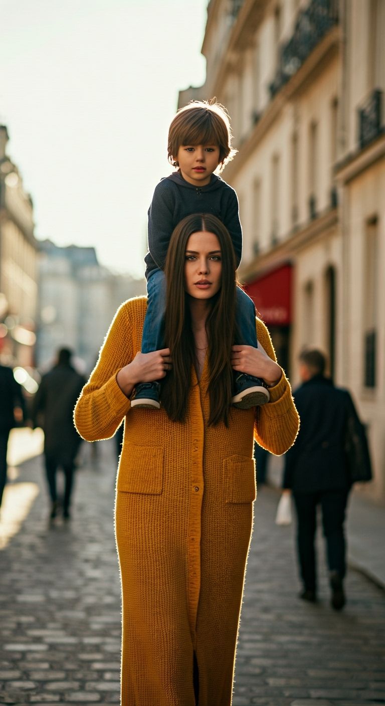 A photorealistic image of a very tall, elegant French woman with long dark hair carrying a boy on her shoulders. Captured with cinematic lighting and bokeh on a 50mm lens.