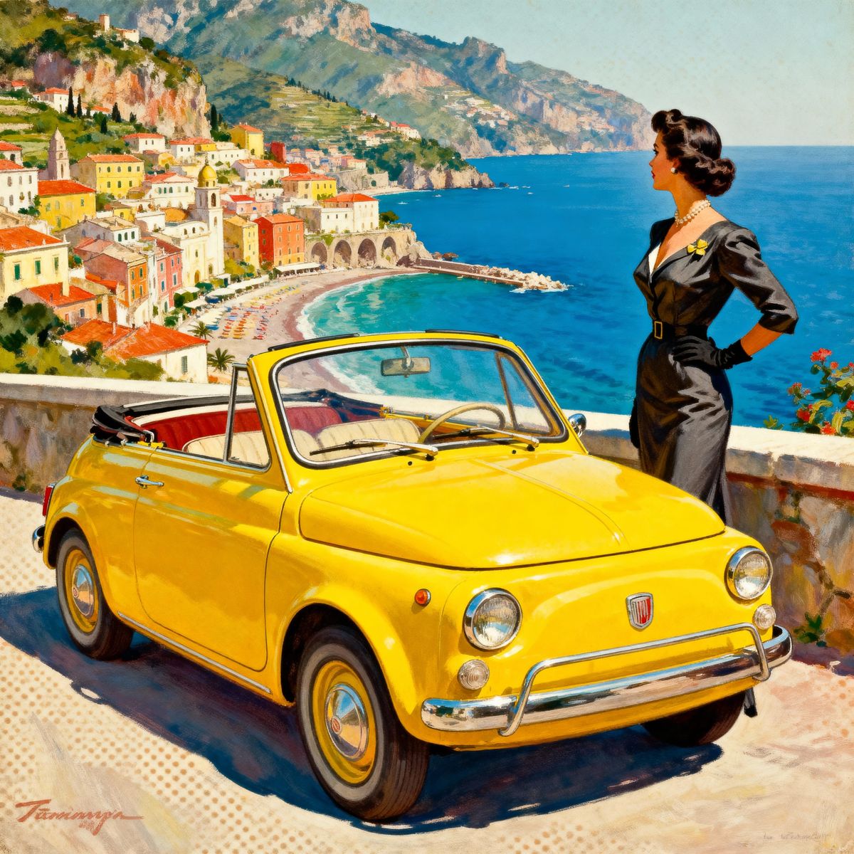 This image captures a sunny, breathtaking view of the Amalfi Coast in a 1950s postcard style. Features a classic Fiat 500 and an elegant woman at a scenic overlook.