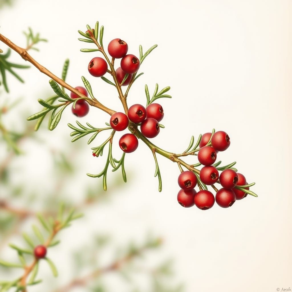 A detailed vintage illustration of a juniper branch covered in berries and green leaves. The image evokes classic botanical art with a whimsical, intricate style.