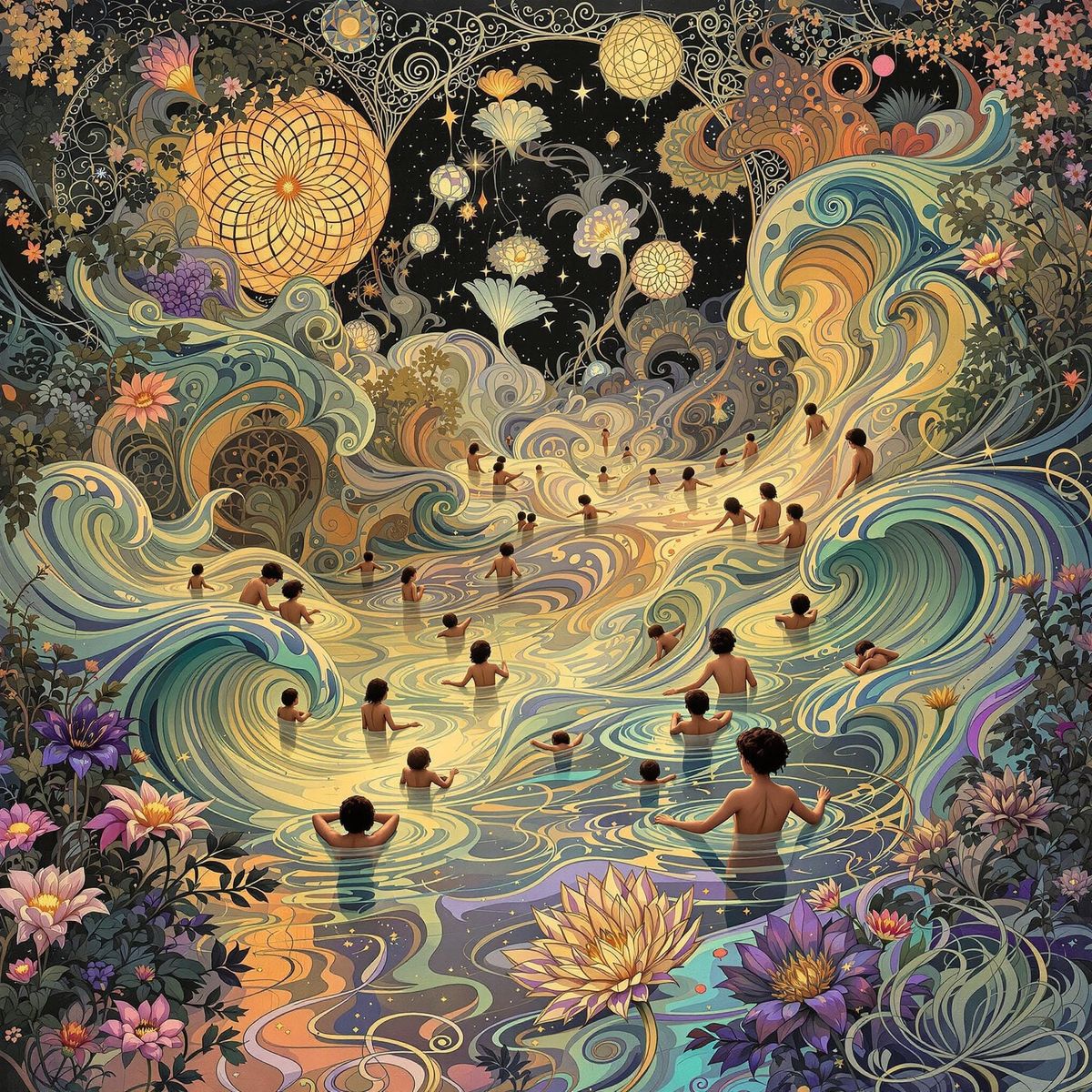 This surreal image depicts tiny figures bathing in shimmering, undulating gel waves, evoking a dreamlike, Art Nouveau-inspired atmosphere with intricate patterns and organic motifs, reminiscent of fantastical, psychedelic realms.