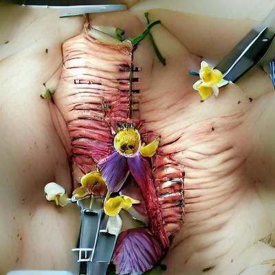 This image shows a surreal medical scene. Flowers bloom from an open rib cage, highlighting themes of healing and the unexpected beauty found in medical contexts.