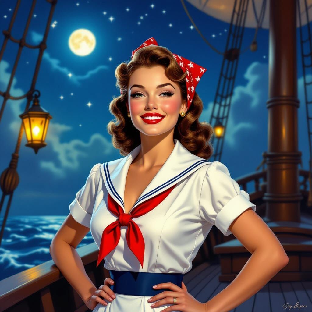 This image features a confident vintage sailor woman in a pin-up pose on a galleon deck under a starry sky. Lanterns and moonlight create a romantic, enchanting atmosphere, rendered in a vibrant, storytelling art style.