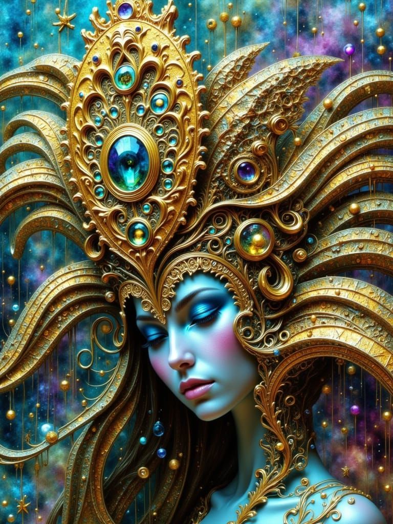 This image features a celestial Goddess of the Sea within a detailed, maximalist seascape. It utilizes volumetric lighting and watercolor effects for depth and ethereal glow.