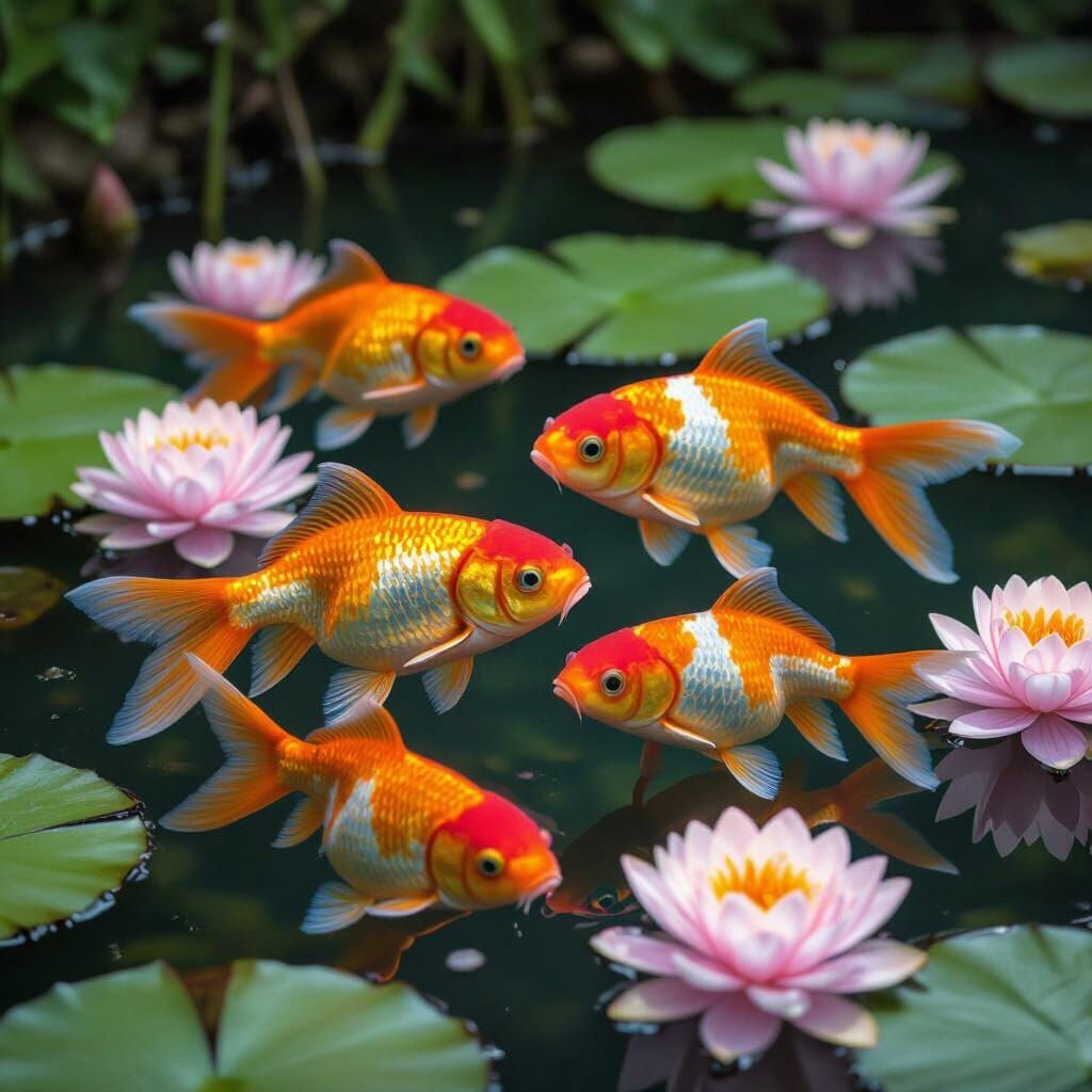 This image showcases a school of brightly colored goldfish gracefully navigating through a tranquil pond filled with blooming lotus flowers. A peaceful aquatic scene.