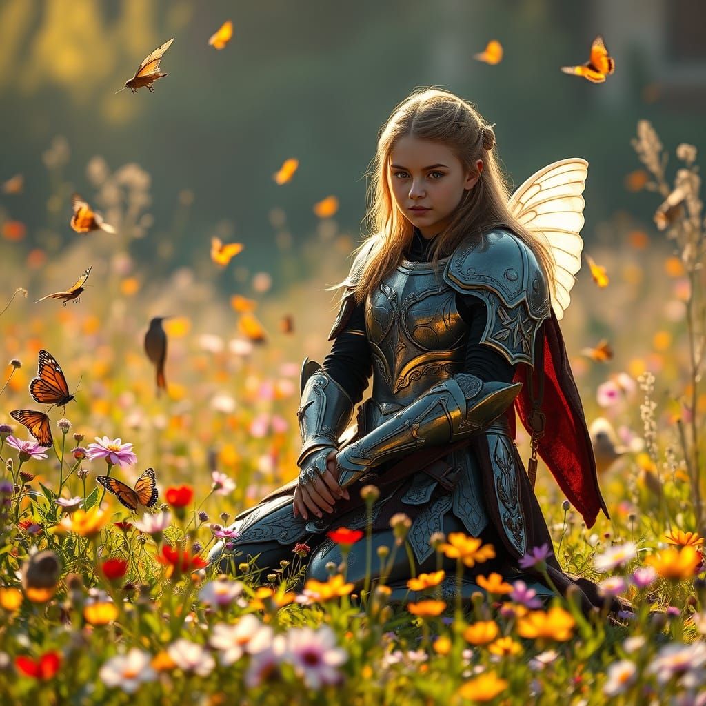 A striking picture of a young valkyrie kneeling in a wildflower field, bathed in the warm glow of sunset. Butterflies and birds flutter around her ornate armor, rendered with hyperrealistic detail and dynamic lighting.