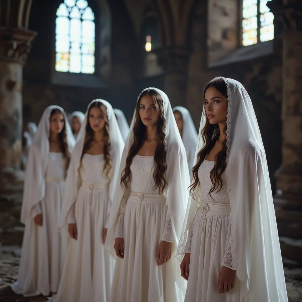 This image shows decaying mansions, ethereal angels in white robes, and dark roses shrouded in mist. The cinematic scene is enhanced with dramatic lighting and a dark color palette, reminiscent of film.