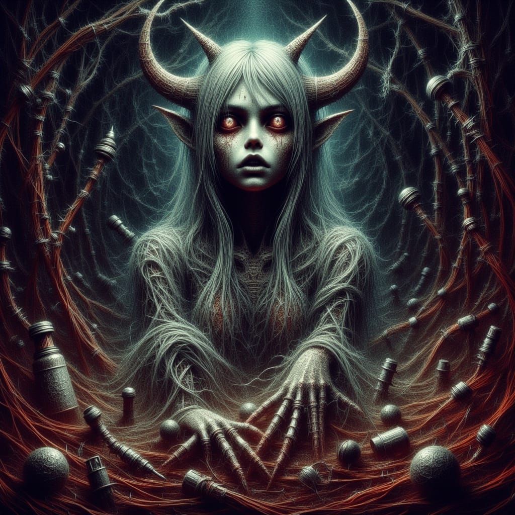This image depicts a gaunt, demonic figure surrounded by ethereal smoke and symbols of addiction, rendered in a dark, surrealist oil painting style with dramatic lighting.