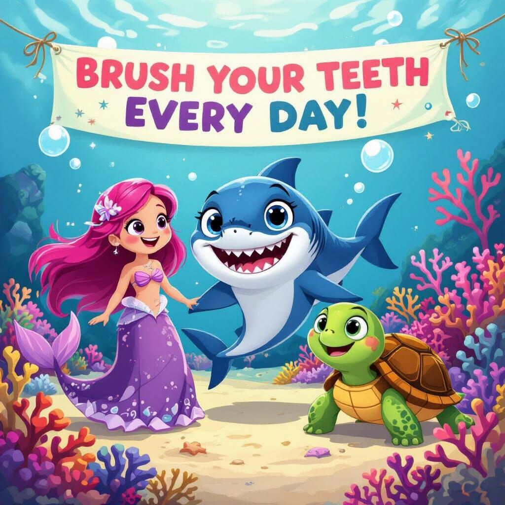 This image shows a joyful cartoon ocean scene with a blue shark, a mermaid with pink hair, and a turtle celebrating together near a coral reef. The characters have joyful expressions in this image with bold lines and bright colors.