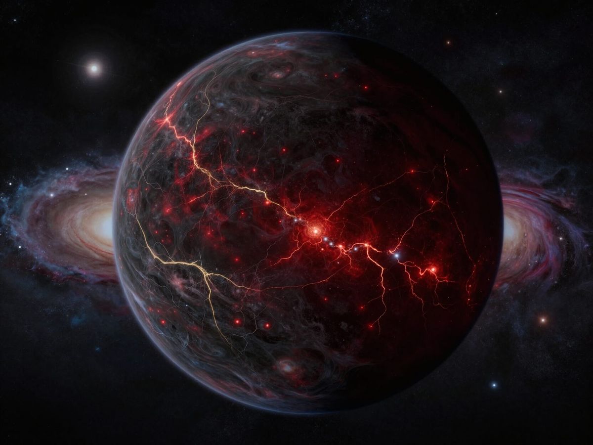 This image features a massive, dark planet with glowing solar-gold veins pulsing beneath its obsidian surface, set against a backdrop of galaxies and stars.
