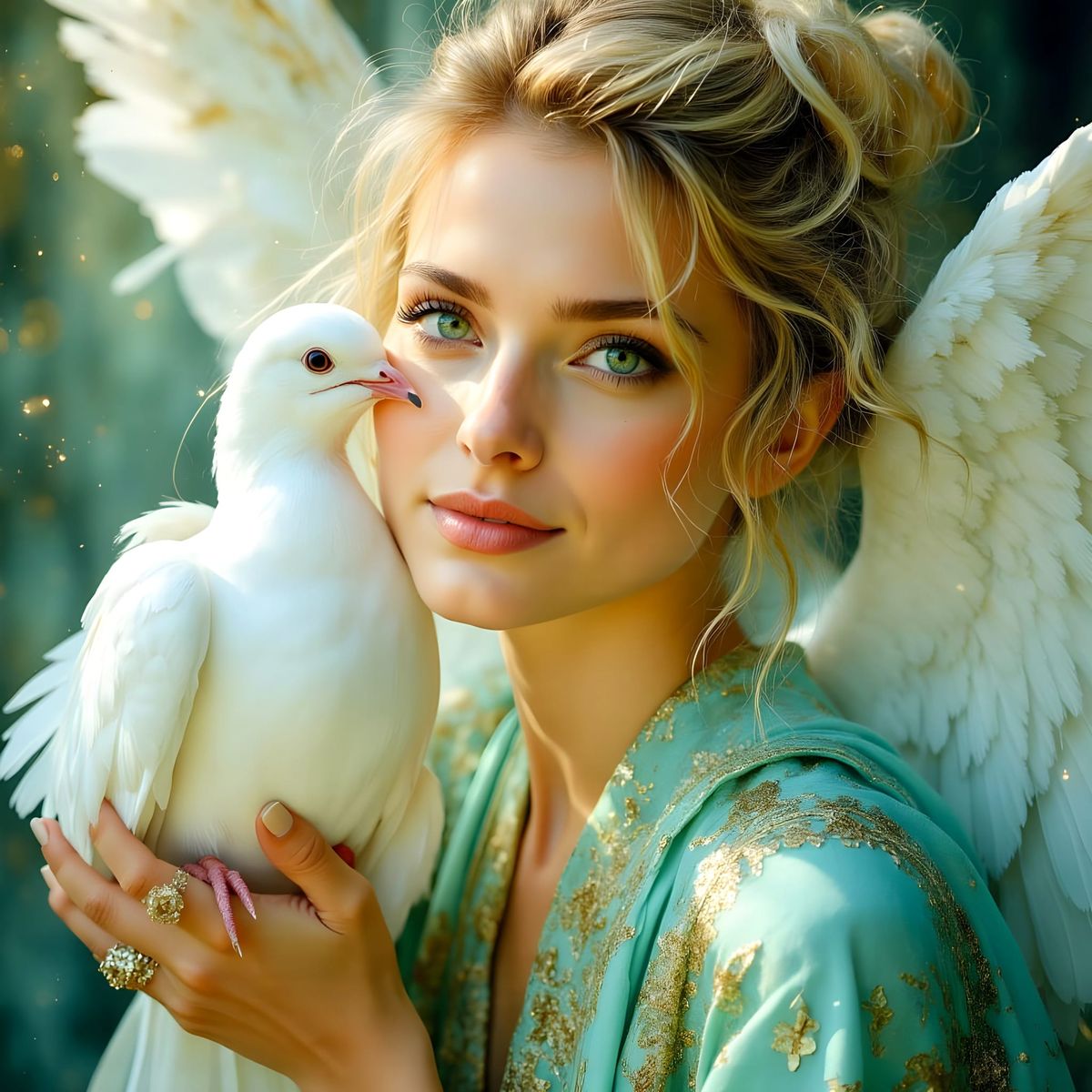 A captivating image features a stunning angel with blonde hair, styled in a messy bun, holding a white dove. Soft sunlight and pastel colors create a dreamy, ethereal atmosphere.