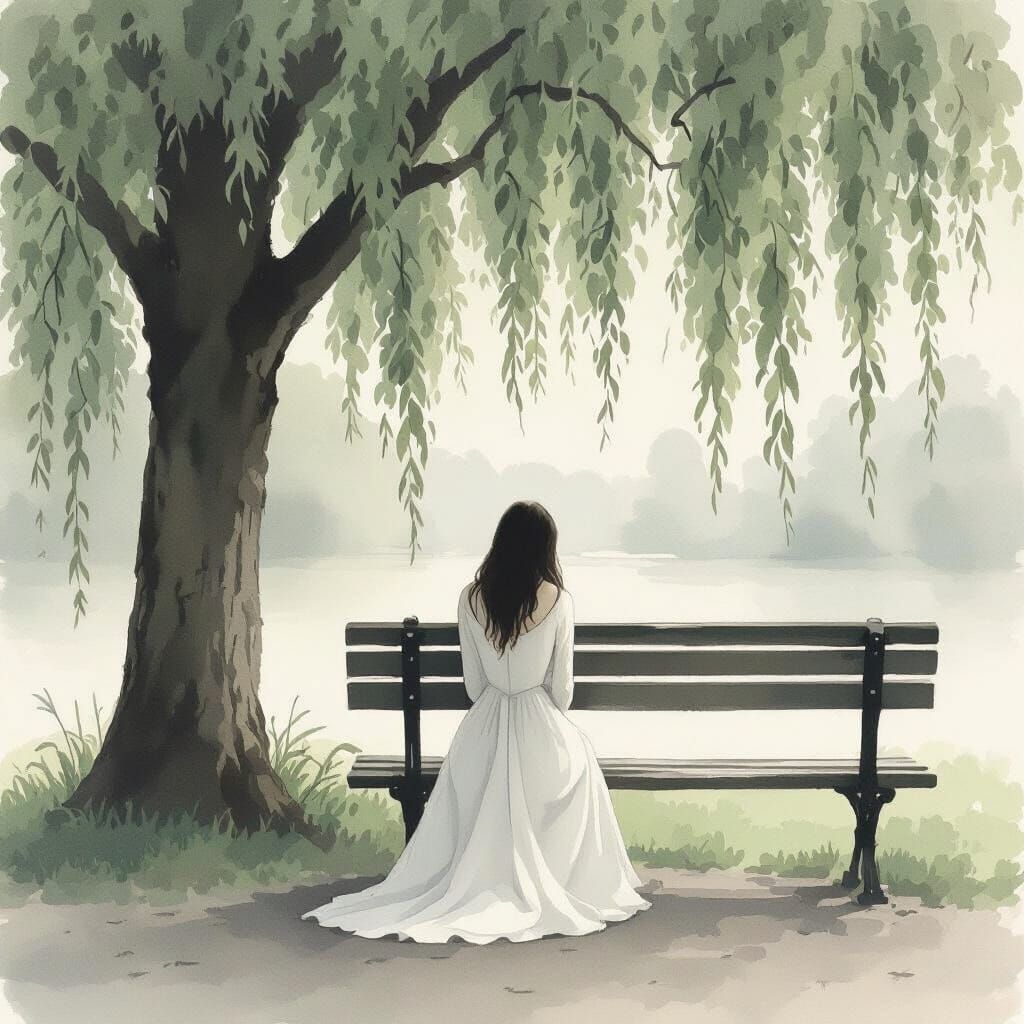 This image depicts a sad woman in a white gown sitting on a park bench. The scene is rendered in a soft, watercolor style with muted greens and greys, evoking a tranquil mood.