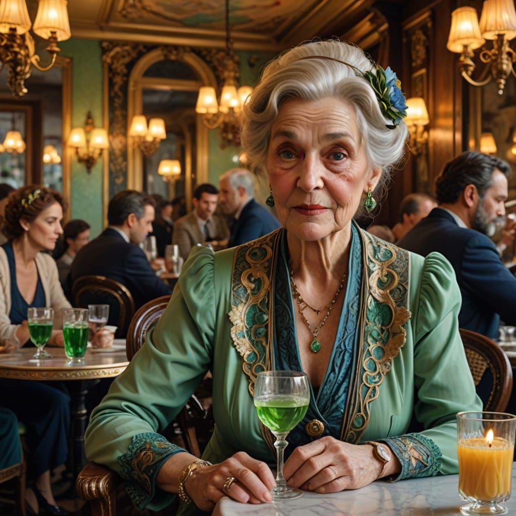 This image captures a lively Paris café scene where a refined old lady savors absinthe and Perrier water amidst lavish furnishings, intricate moldings, and warm golden light, with soft brushstrokes and muted colors.