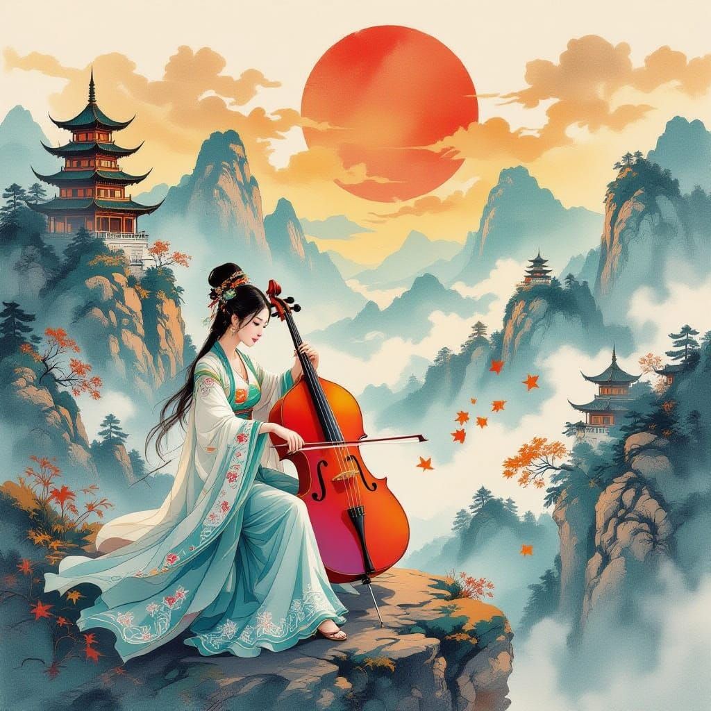 This image depicts a serene scene of a young woman playing a colorful cello on a mountain cliff, overlooking a traditional Chinese landscape of misty teal peaks and intricately carved pagodas, bathed in warm golden light and fiery red hues, blending traditional and contemporary elements in a vibrant mixe...